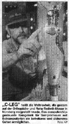 Mit dieser Anzeige in der Offenbach-Post vom 7. Mai 1997 fing alles an. Kurz später, am 24. Juli, war ich, dank der Berufsgenossenschaft der chemischen Industrie, und natürlich dank des Herstellers und Entwicklers, der Firma Otto Bock, der stolze Besitzer eines C-Leg. Der erste Prototyp wurde von einem Kanadier entwickelt. Bis zur Serienreife dauerte es 10 Jahre.